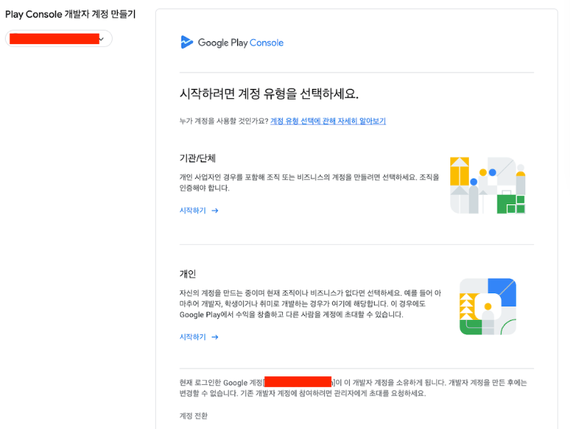 계정 유형 (기관/단체, 개인)에 맞게 시작하기 -> 버튼 클릭 후 아래 이미지 순서로 진행