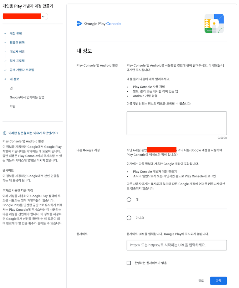 Play Console 및 Android를 사용한 경험이 있는지, 보유한 웹 사이트가 있는지 등의 정보등을 입력하는 단계