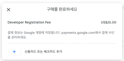 마지막 단계로 신용카드 및 체크카드를 추가하여 US$25를 결제하시면 개발자 등록 신청이 완료됩니다.