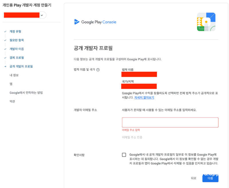 법적 이름, 국가/지역이 현재 개발 등록자 정보와 일치한지 확인